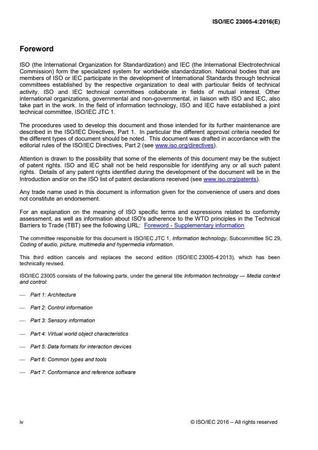 ISO/IEC 23005-4:2016 is a standard published by the International Organization for Standardization (ISO). Its full title is "Information technology — Media context and control — Part 4: Virtual world object characteristics". This standard covers: ISO/IEC 23005-4:2016 specifies syntax and semantics of description schemes and descriptors used to characterize a virtual world object related metadata, making it possible to migrate a virtual world object (or only its characteristics) from one virtual world to another and to control a virtual world object in a virtual world by real world devices.