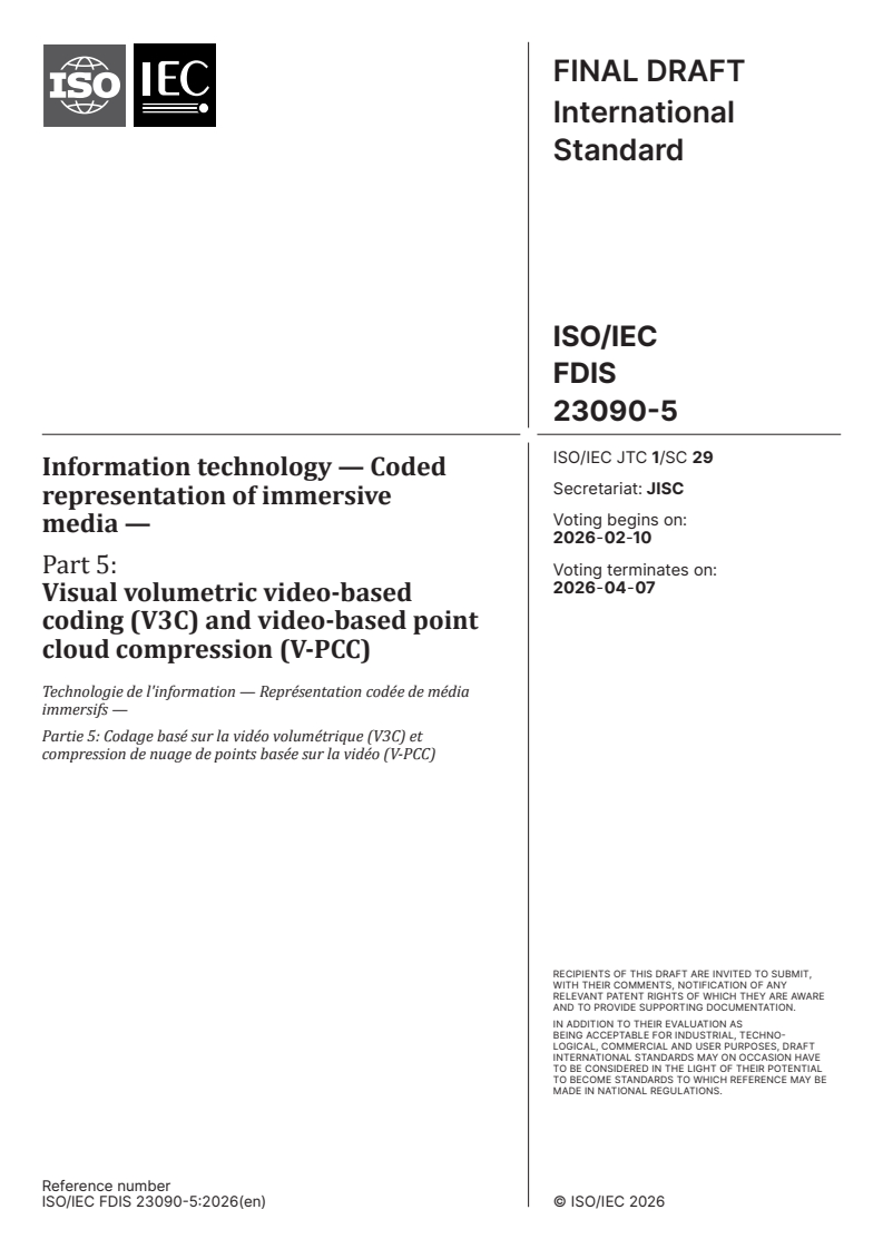 ISO/IEC FDIS 23090-5 - Information technology — Coded representation of immersive media — Part 5: Visual volumetric video-based coding (V3C) and video-based point cloud compression (V-PCC) Released:27. 01. 2026