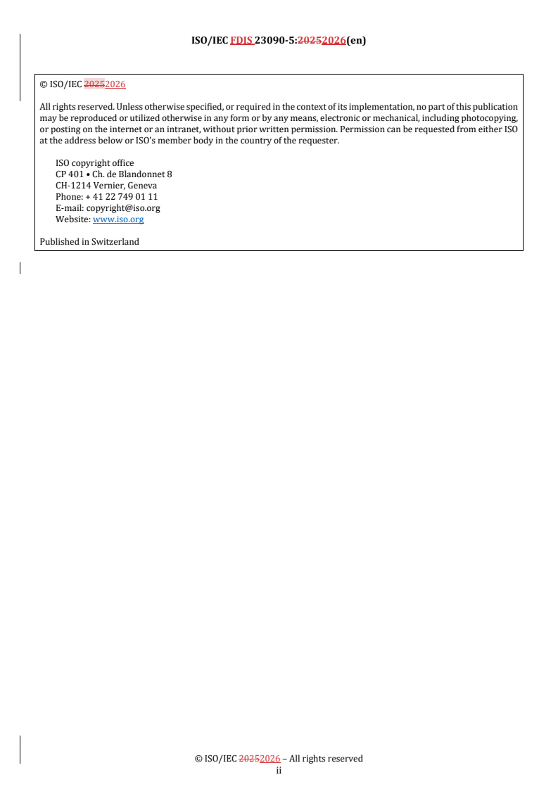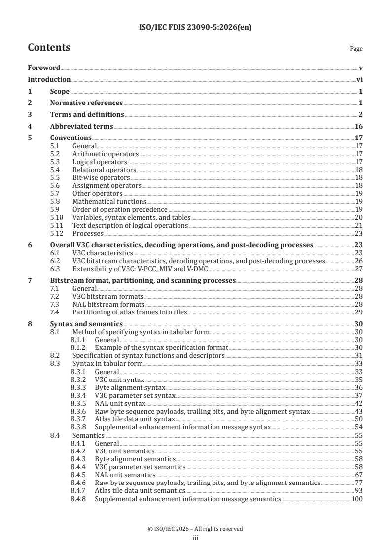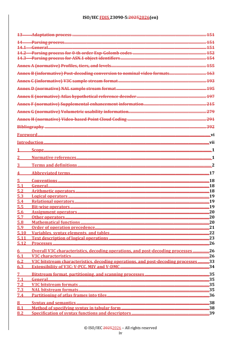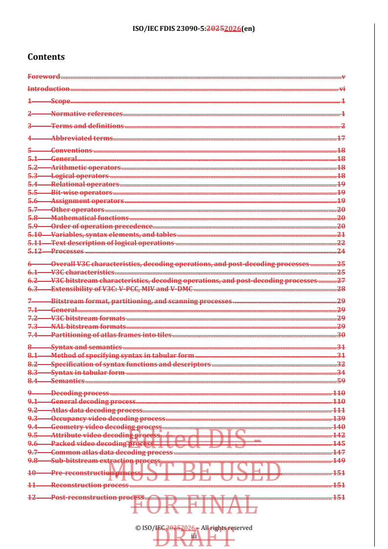 REDLINE ISO/IEC FDIS 23090-5 - Information technology — Coded representation of immersive media — Part 5: Visual volumetric video-based coding (V3C) and video-based point cloud compression (V-PCC) Released:27. 01. 2026