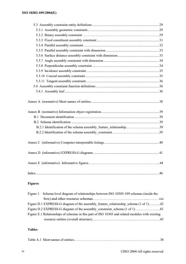 ISO 10303-109:2004 specifies the resource constructs for the representation of detailed geometric relationships between constituents of an assembly model including geometric constraints between constituents. The following are within the scope of ISO 10303-109:2004: association of shape aspect relationship with its representation; association of instanced assembly feature relationship with its representation; representation of detailed geometric information of instanced assembly feature relationship at the geometric_representation_item level in terms of elements such as assembly geometric constraints, kinematics pair and kinematics path; representation of the fixed constituent which plays the anchor role in the assembly model. The following are outside the scope of ISO 10303-109:2004: product structure configurations of assemblies and their constituents; tolerance information.