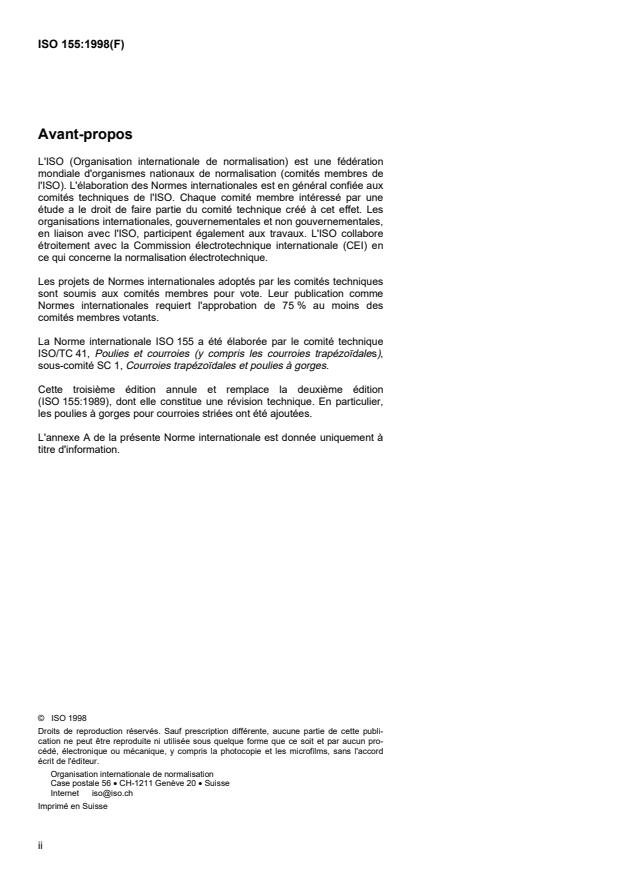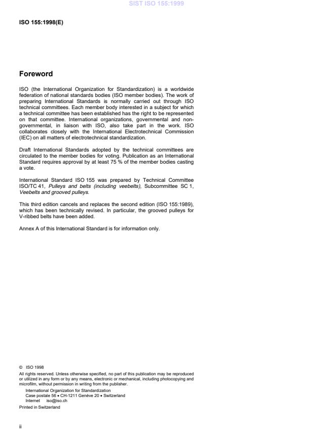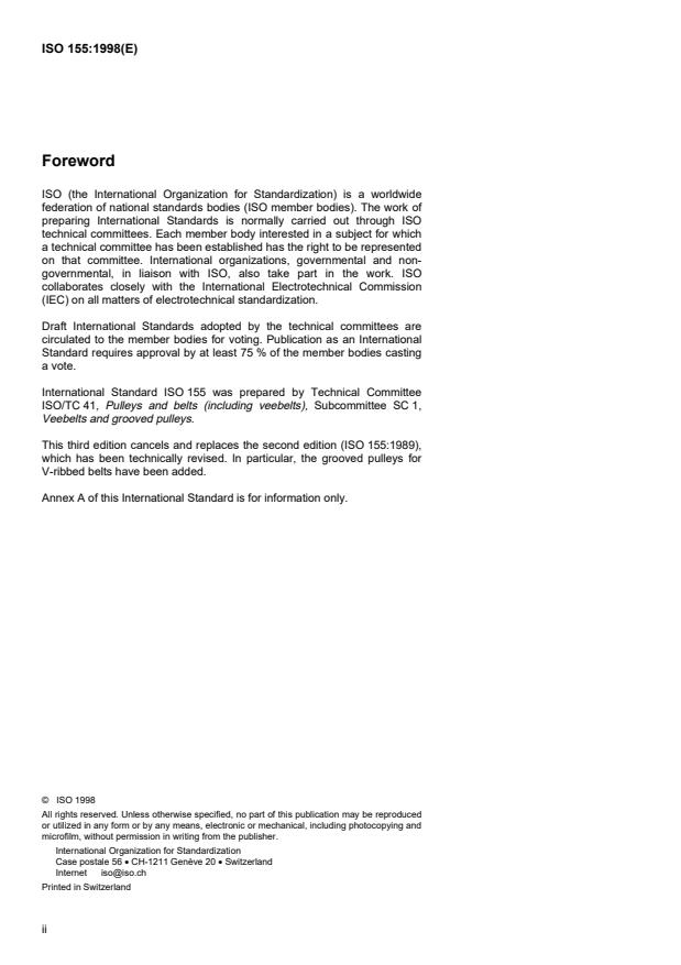 ISO 155:1998 is a standard published by the International Organization for Standardization (ISO). Its full title is "Belt drives — Pulleys — Limiting values for adjustment of centres". This standard covers: Belt drives — Pulleys — Limiting values for adjustment of centres