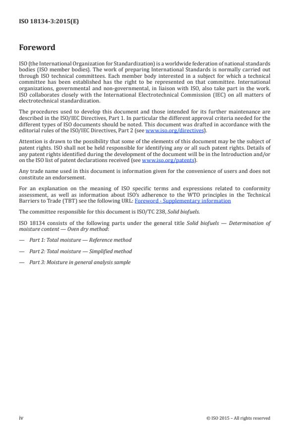 ISO 18134-3:2015 is a standard published by the International Organization for Standardization (ISO). Its full title is "Solid biofuels — Determination of moisture content — Oven dry method — Part 3: Moisture in general analysis sample". This standard covers: ISO 18134-3:2015 describes the method of determining the moisture in the analysis test sample by drying in an oven. It is intended to be used for general analysis samples in accordance with EN 14780. The method described in this part of ISO 18134-3:2015 is applicable to all solid biofuels. The moisture content of solid biofuels (as received) is always reported based on the total mass of the test sample (wet basis). Since biofuels in small particle size are very hygroscopic, their moisture content will change with humidity in the atmosphere and therefore, the moisture of the test portion is determined simultaneously with determination of for example calorific value, carbon content, and nitrogen content. NOTE The term moisture content when used with biomass materials can be misleading since untreated biomass frequently contains varying amounts of volatile compounds (extractives) which can evaporate when determining the moisture content by oven drying (see References [1] and [2]).