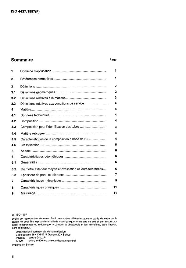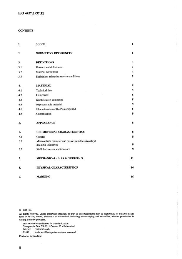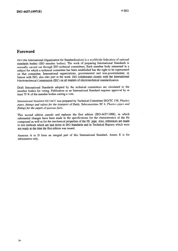 ISO 4437:1997 is a standard published by the International Organization for Standardization (ISO). Its full title is "Buried polyethylene (PE) pipes for the supply of gaseous fuels — Metric series — Specifications". This standard covers: Buried polyethylene (PE) pipes for the supply of gaseous fuels — Metric series — Specifications