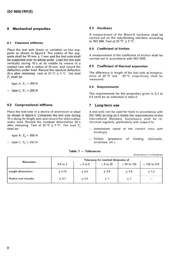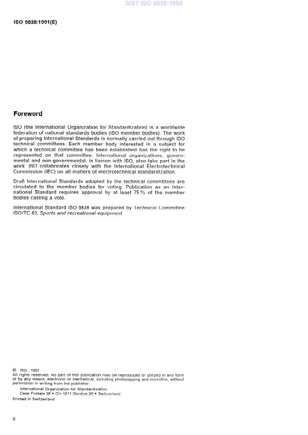 ISO 9838:1991 is a standard published by the International Organization for Standardization (ISO). Its full title is "Alpine ski-bindings — Test soles for ski-binding tests". This standard covers: Defines a test sole representing a ski-boot, or at least the bottom part of it, to be used for testing alpine ski-bindings. Includes sole type A (for adults) and type C (for children).