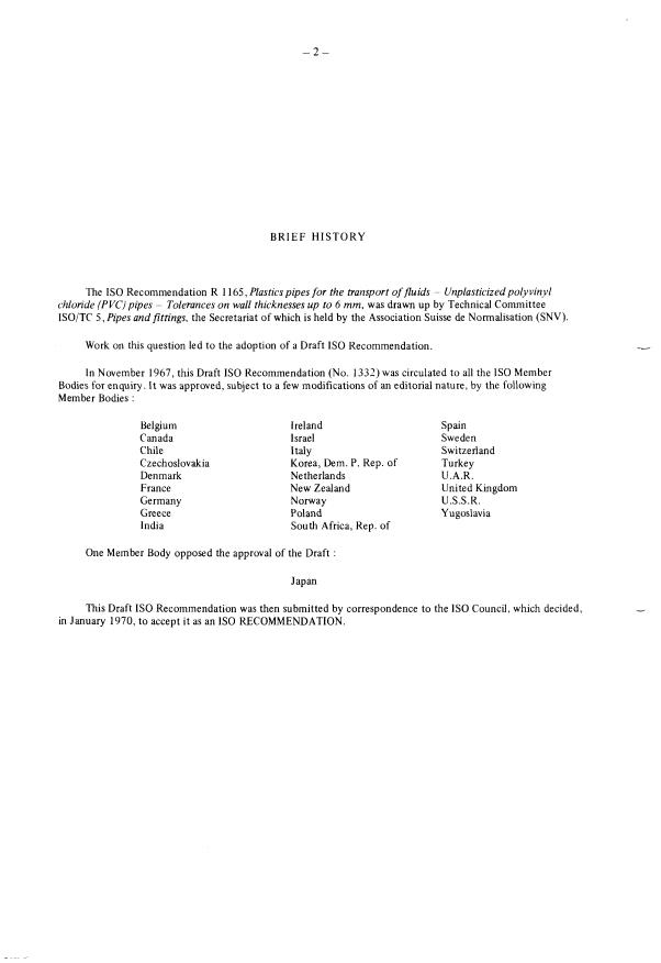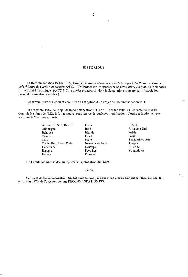 The IS0 Recommendation R 1 165, Plastics pipes for the transport of fluids - Unplasticized polyvinyl