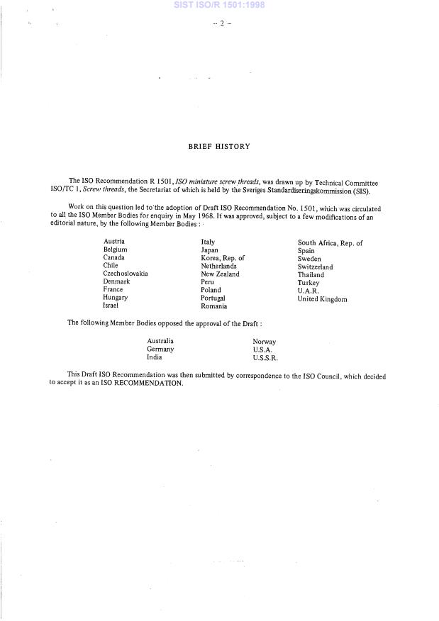 ISO/R 1501:1970 is a standardization document published by the International Organization for Standardization (ISO). Its full title is "ISO miniature screw threads". This standard covers: ISO miniature screw threads