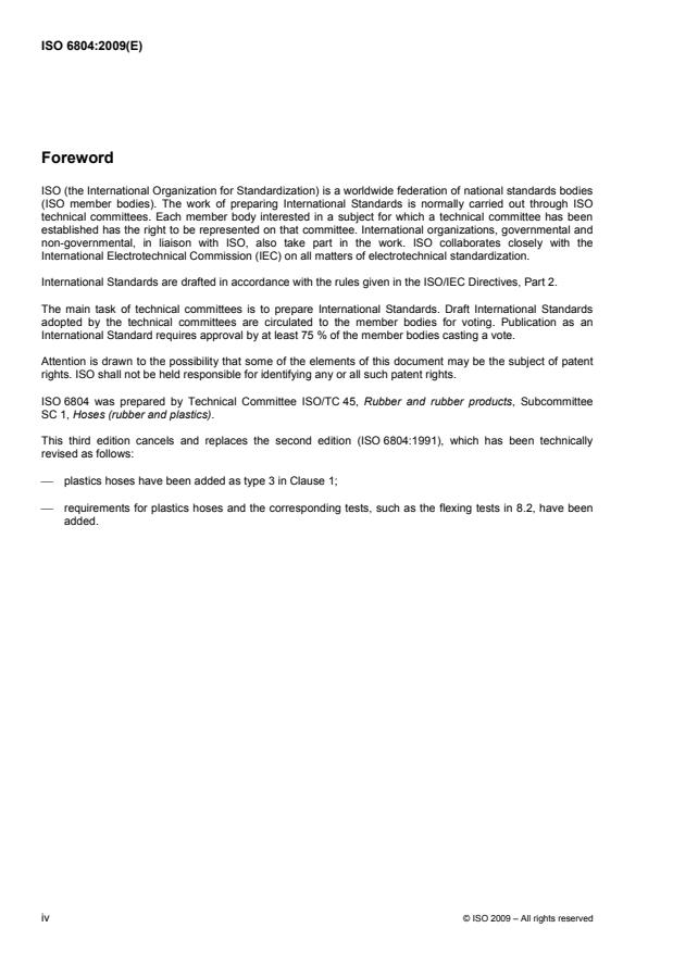 ISO 6804:2009 is a standard published by the International Organization for Standardization (ISO). Its full title is "Rubber and plastics inlet hoses and hose assemblies for washing-machines and dishwashers — Specification". This standard covers: ISO 6804:2009 specifies the requirements for three types of rubber or plastics inlet hoses and hose assemblies for washing-machines and dishwashers connected to the domestic water supply at a pressure not exceeding 1 MPa (10 bar). It is applicable to the following types of hose: Type 1: rubber hoses for unheated water supply (maximum temperature 70 °C). Type 2: rubber hoses for heated water supply (maximum temperature 90 °C). Type 3: plastics hoses for unheated water supply (maximum temperature 60 °C).