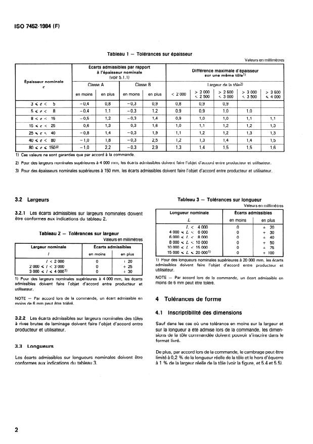 2) Pour des largeurs nominales supérieures à 4 000 mm, les écarts admissibles doivent faire l’objet d’accord entre producteur et utilisateur.
