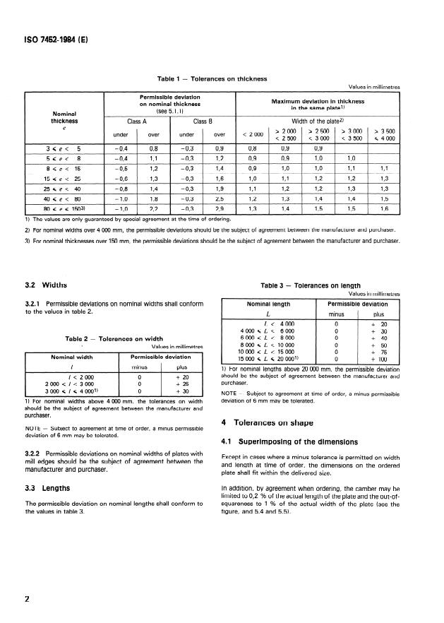 ISO 7452:1984 is a standard published by the International Organization for Standardization (ISO). Its full title is "Hot-rolled structural steel plates — Tolerances on dimensions and shape". This standard covers: Applies to hot-rolled, non-alloyed, alloyed and stainless steel plates of nominal thickness up to 150 mm and of width up to 4 000 mm whose specified minimum yield stress is equal to or less than 700 N/mm . Does not include round plate, custom-made plate, checker plate or bulb plate for flooring or wide flats.