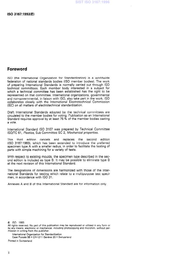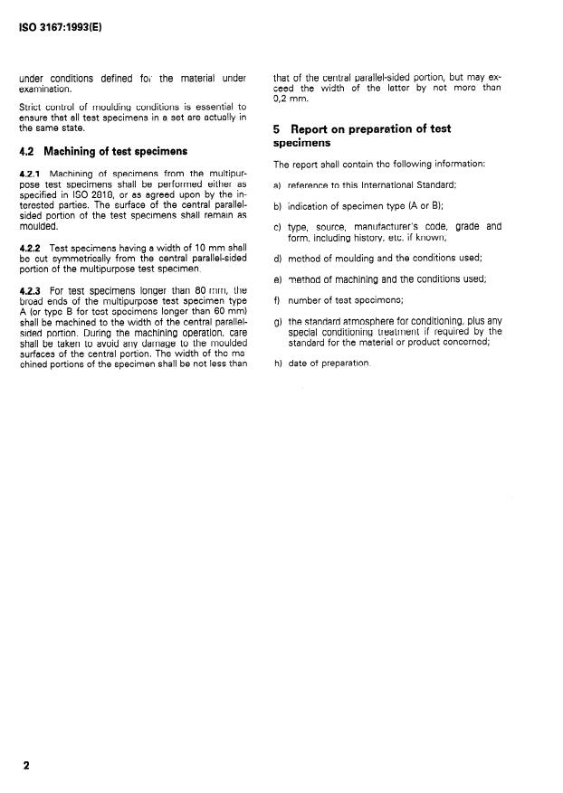 ISO 3167:1993 is a standard published by the International Organization for Standardization (ISO). Its full title is "Plastics — Multipurpose test specimens". This standard covers: Specifies requirements relating to multipurpose test specimens (i.e. specimens of type A and B being tensile test specimens only, from which, however, with simple machining, specimens for a variety of other tests can be taken allowing all the test methods mentioned in annex A to be carried out on the basis of comparable mouldings) for plastic moulding materials intended for processing by injection or direct compression moulding.