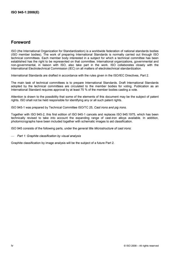 ISO 945-1:2008 is a standard published by the International Organization for Standardization (ISO). Its full title is "Microstructure of cast irons — Part 1: Graphite classification by visual analysis". This standard covers: ISO 945-1:2008 specifies a method of classifying the microstructure of graphite in cast irons by comparative visual analysis. The purpose of this part of ISO 945 is to provide information about the method of graphite classification. It is not intended to give information on the suitability of cast-iron types and grades for any particular application. The particular material grade is specified by results from tensile tests or hardness testing and, in the case of austenitic cast irons, by their chemical composition. The interpretation of graphite form and size does not allow a statistically valid statement on the fulfilment of the requirements specified in the relevant material standard. The structure of the metallic matrix (e.g. ferrite, pearlite) has a significant effect on the material properties. Such an interpretation is not the purpose of this part of ISO 945.