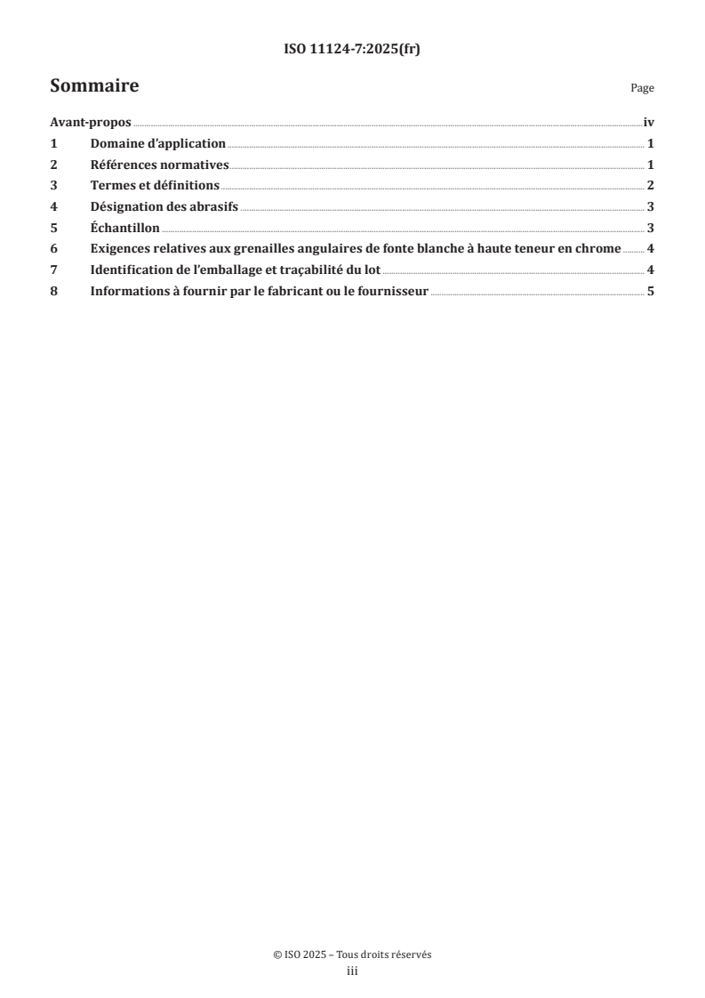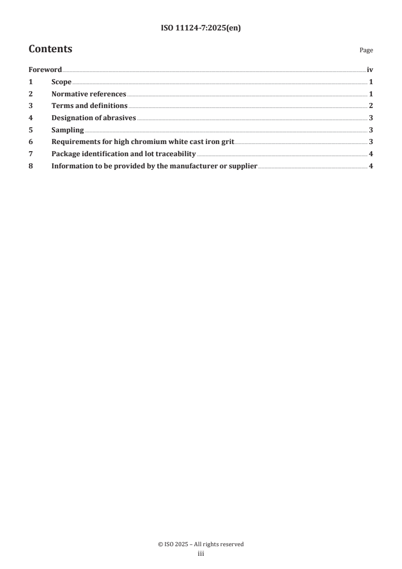Keywords: ISO 11124-7:2025, high chromium white cast iron grit, metallic blast-cleaning abrasives, particle size, hardness, blast-cleaning, abrasive recovery, metallographic structure, chemical composition, traceability.