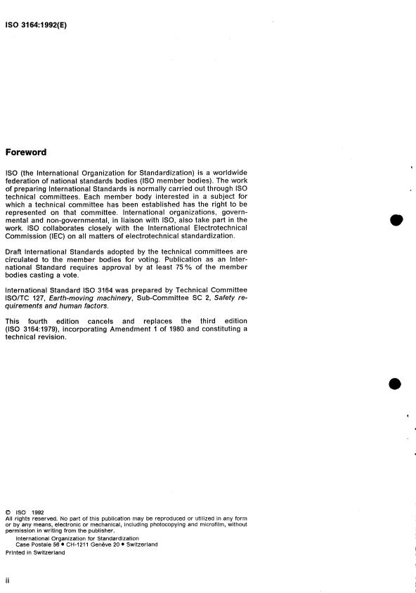 ISO 3164:1992 is a standard published by the International Organization for Standardization (ISO). Its full title is "Earth-moving machinery — Laboratory evaluations of roll-over and falling-object protective structures — Specifications for deflection-limiting volume". This standard covers: Earth-moving machinery — Laboratory evaluations of roll-over and falling-object protective structures — Specifications for deflection-limiting volume