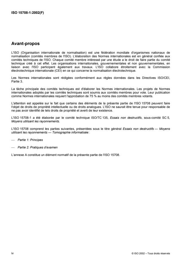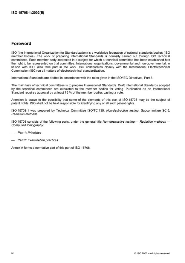 ISO 15708-1:2002 is a standard published by the International Organization for Standardization (ISO). Its full title is "Non-destructive testing — Radiation methods — Computed tomography — Part 1: Principles". This standard covers: ISO 15708-1 provides a tutorial introduction to the theory and use of computed tomography. It begins with an overview intended for the interested reader possessing a general technical background. Subsequent, more technical clauses describe the physical and mathematical basis of CT technology, the hardware and software requirements of CT equipment, and the fundamental measures of CT performance. This part of ISO 15708 includes an extensive glossary (with discussions) of CT terminology and an extensive list of references to more technical publications on the subject. Most importantly, this part of ISO 15708 establishes consensus definitions for basic measures of CT performance, enabling purchasers and suppliers of CT systems and services to communicate unambiguously with reference to a recognized standard. It also provides a few carefully selected equations relating measures of CT performance to key system parameters. ISO 15708-1 gives guidelines for, and defines terms for addressing the general principles of X-ray CT as they apply to industrial imaging. It also gives guidelines for a consistent set of CT performance parameter definitions, including how these performance parameters relate to CT system specifications.
