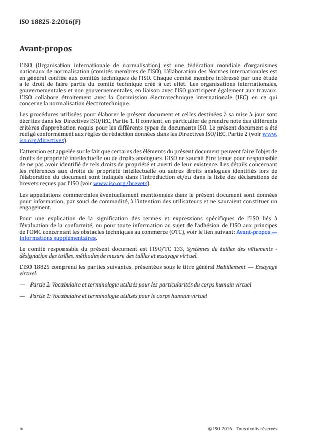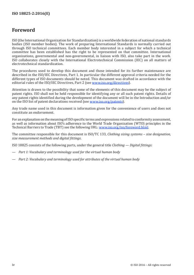 ISO 18825-2:2016 is a standard published by the International Organization for Standardization (ISO). Its full title is "Clothing - Digital fittings - Part 2: Vocabulary and terminology used for attributes of the virtual human body". This standard covers: ISO 18825-2:2016 defines the terms used to describe the virtual human body which is used in virtual garment systems. Specifically, virtual body landmarks and virtual body dimensions are described. It mainly deals with vocabulary and terminology of essential virtual body dimensions of the virtual torso, arm, leg, head, face, hands and bones and joints of virtual human body. Since there are many body landmarks on the head and hand, landmarks on these parts are defined separately from those on other parts of the body. It is intended for developers of virtual garment systems. Although ISO 18825-2:2016 does not aim at users of virtual human body in online communication, the improved reliability of virtual human body will benefit them.