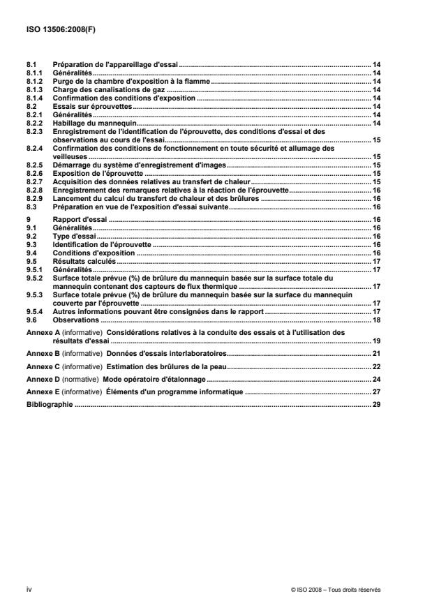ISO 13506:2008 provides the general principles of a test method for evaluating the performance of complete garments or protective clothing ensembles in a flash fire or other short duration exposures. This test method characterizes the thermal protection provided by garments, based on the measurement of heat transfer to a full-size manikin exposed to a laboratory simulation of a fire with controlled heat flux density, duration and flame distribution. The heat transfer measurements can also be used to calculate the predicted skin burn injury resulting from the exposure. In addition, observations are recorded on the overall behaviour of the test specimen during and after the exposure.