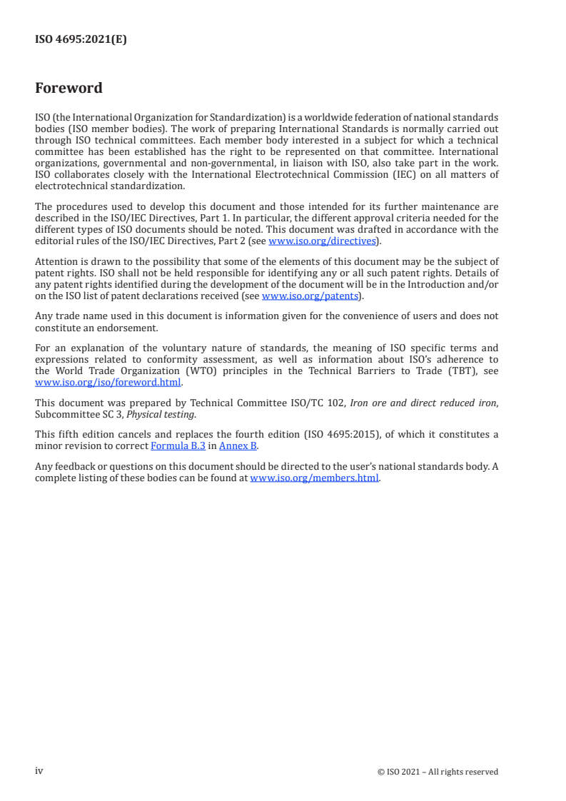 Keywords: ISO 4695:2021, reducibility, rate of reduction index, iron ores, blast furnace feedstocks, lump ores, sinter, pellets, CO/N2 reducing gas, 950 °C, fixed bed, quality control.