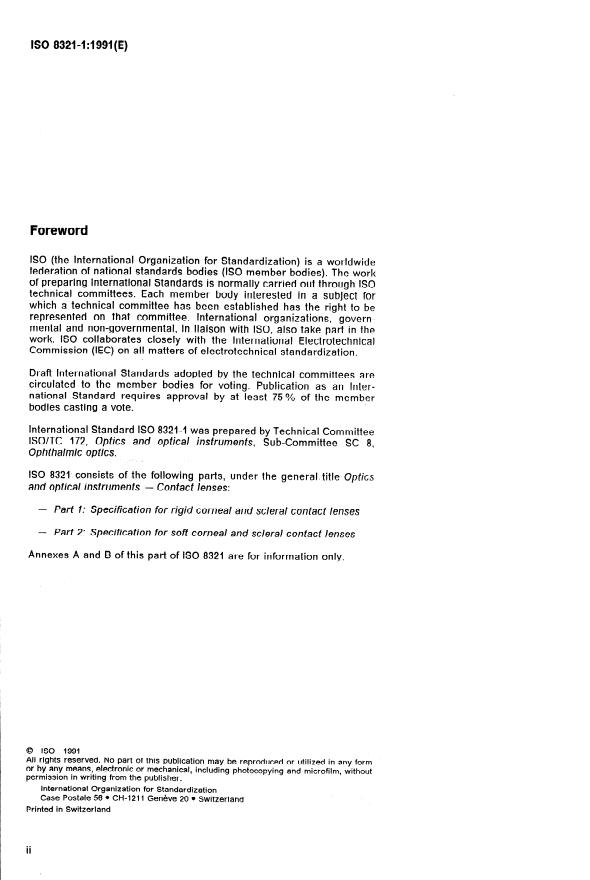 ISO 8321-1:1991 is a standard published by the International Organization for Standardization (ISO). Its full title is "Optics and optical instruments — Contact lenses — Part 1: Specification for rigid corneal and scleral contact lenses". This standard covers: Specifies requirements for contact lenses as supplied by a manufacturer according to a prescription from a practitioner. Does not apply to soft contact lenses in a dry state. Annexes A and B are for information only.