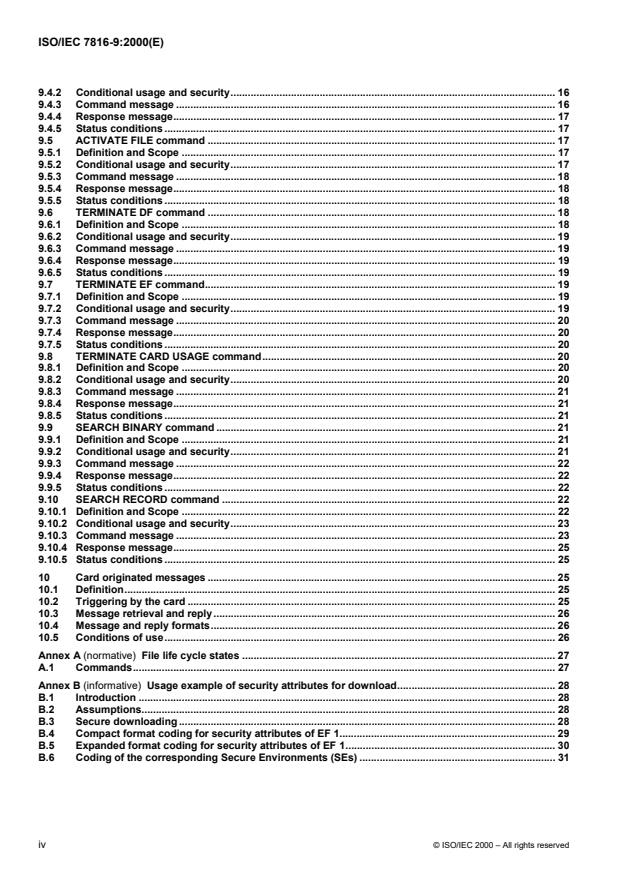 ISO/IEC 7816-9:2000 is a standard published by the International Organization for Standardization (ISO). Its full title is "Identification cards — Integrated circuit(s) cards with contacts — Part 9: Additional interindustry commands and security attributes". This standard covers: Identification cards — Integrated circuit(s) cards with contacts — Part 9: Additional interindustry commands and security attributes