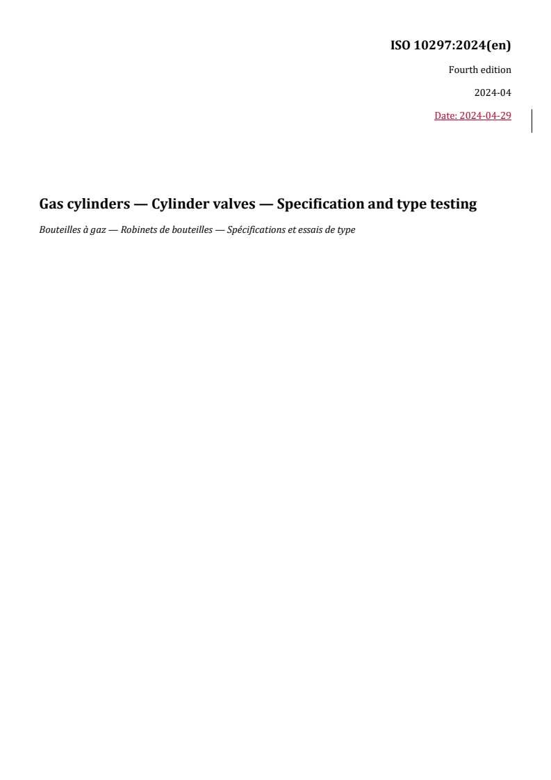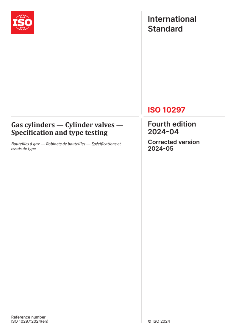 ISO 10297:2024 - Gas cylinders — Cylinder valves — Specification and type testing Released:1. 04. 2024