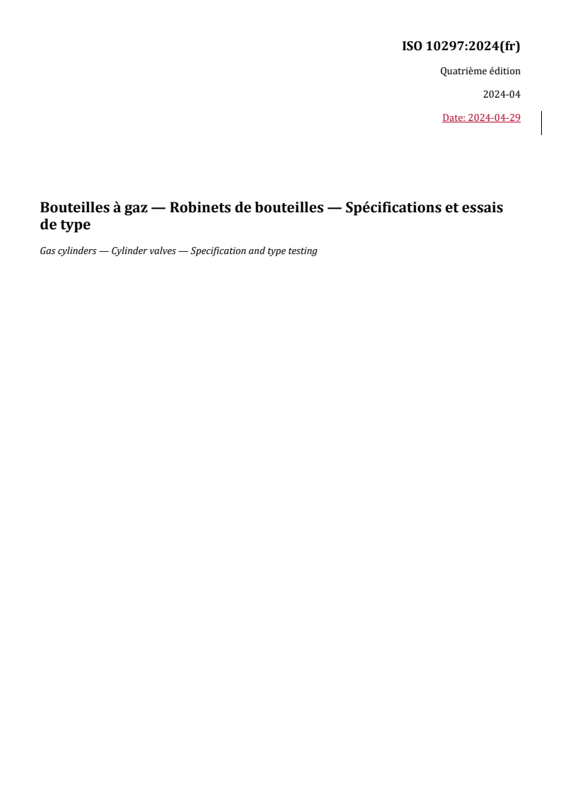 ISO 10297:2024 - Bouteilles à gaz — Robinets de bouteilles — Spécifications et essais de type Released:5/17/2024