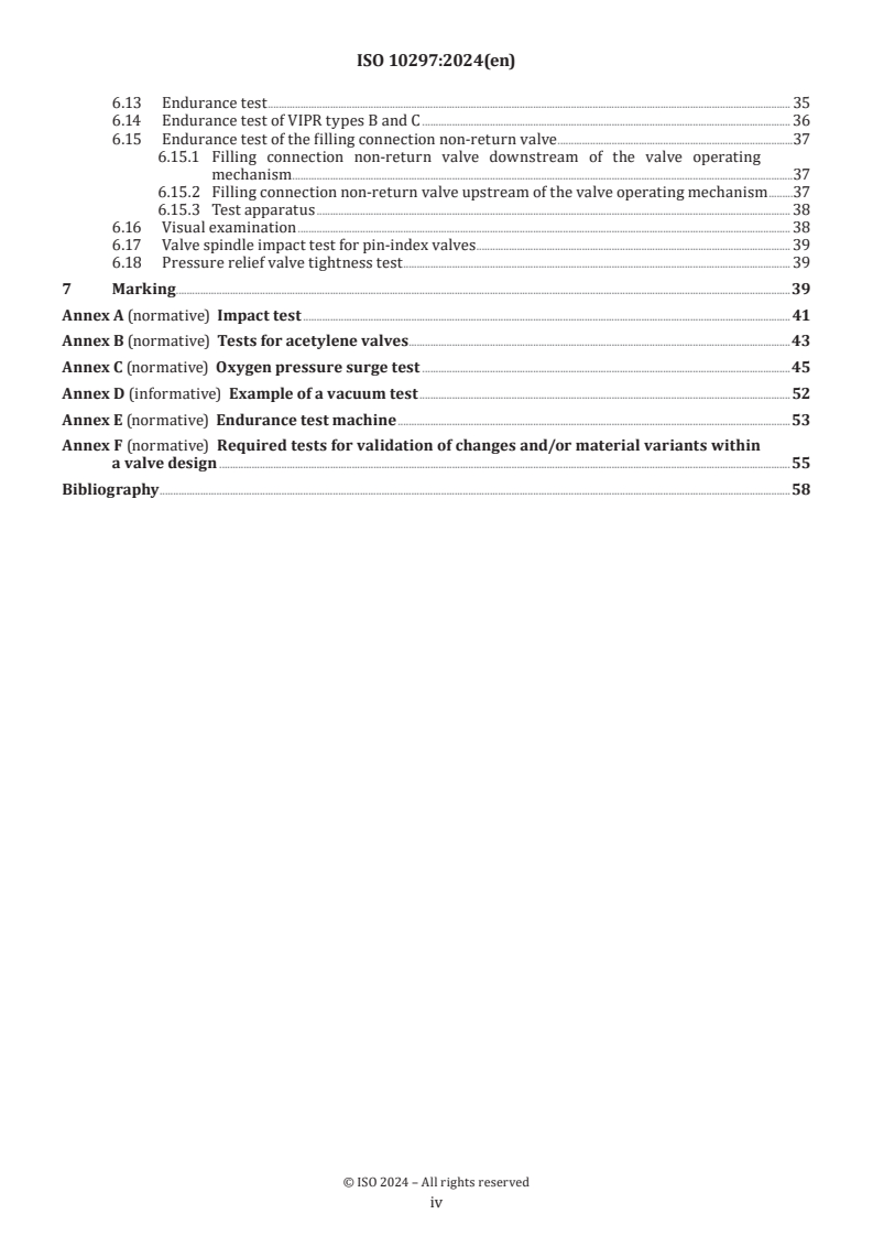 ISO 10297:2024 is a standard published by the International Organization for Standardization (ISO). Its full title is "Gas cylinders — Cylinder valves — Specification and type testing". This standard covers: This document specifies design, type testing and marking requirements for: a) cylinder valves intended to be fitted to refillable transportable gas cylinders; b) main valves (excluding ball valves) for bundles of cylinders; c) cylinder valves or main valves with integrated pressure regulator (VIPR); NOTE 1 This includes the following specific VIPR designs where: 1) The pressure regulating system is acting as the primary valve operating mechanism (VIPR type B). This also includes designs where closure of the primary valve operating mechanism is obtained by closing the seat of the pressure regulating mechanism. 2) The primary valve operating mechanism is located at the low-pressure side of the pressure regulating system (VIPR type C). d) valves for pressure drums and tubes; which convey compressed, liquefied or dissolved gases. NOTE 2 Where there is no risk of ambiguity, cylinder valves, main valves, VIPRs and valves for pressure drums and tubes are addressed with the collective term “valves” within this document. This document does not apply to — valves for cryogenic equipment, portable fire extinguishers and liquefied petroleum gas (LPG); — quick-release cylinder valves (e.g. for fire-extinguishing, explosion protection and rescue applications) - requirements for quick-release cylinder valves are specified in ISO 17871 which contains normative references to this document; — self-closing cylinder valves and ball valves. NOTE 3 Requirements for valves for cryogenic vessels are specified in ISO 21011 and at a regional level, e.g. in EN 1626. Requirements for LPG valves are specified in ISO 14245 or ISO 15995. Requirements for self-closing cylinder valves are specified in ISO 17879. Requirements for ball valves are specified in ISO 23826. Requirements for valves for portable fire extinguishers at a regional level are specified, for example, in the EN 3 series. This document only covers the function of a valve as a closure. Other functions that are possibly integrated in the valve can be covered by other standards. Such standards do however not constitute requirements according to this document. NOTE 4 Definition of and specific requirements for VIPRs in addition to those that are given in this document are specified in ISO 22435 for industrial applications or ISO 10524-3 for medical applications. Similarly, certain specific requirements for residual pressure valves (RPV) with or without a non-return function in addition to those that are given in this document are given in ISO 15996. NOTE 5 Certain specific requirements for valves for breathing apparatus in addition to those that are given in this document are specified at a regional level, for example, in the EN 144 series. Certain specific requirements for quick-release valves for fixed fire-fighting systems in addition to those that are given in this document are specified in ISO 16003 and at a regional level, for example, in EN 12094–4. NOTE 6 Requirements for manufacturing tests and examinations of valves covered by this document are given in ISO 14246.