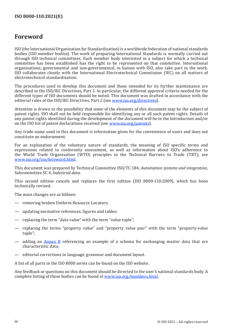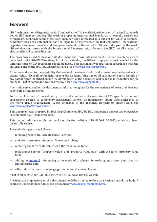 ISO 8000-110:2021 is a standard published by the International Organization for Standardization (ISO). Its full title is "Data quality — Part 110: Master data: Exchange of characteristic data: Syntax, semantic encoding, and conformance to data specification". This standard covers: This document specifies requirements for the exchange of messages that contain master data consisting of characteristic data. These requirements can be checked by computer. The messages are suitable for exchange between organizations and between systems. EXAMPLE 1 A supplier sends a message to a customer. The message contains characteristic data describing an item that the customer is considering buying. The following are within the scope of this document: — conformance of master data messages to a formal syntax; — semantic encoding of master data messages; — conformance of master data messages to data specifications; — requirements on access to the data dictionaries that enable decoding of master data messages. The following are outside the scope of this document: — master data that are not characteristic data; — data that are not in messages; — messages that do not exchange master data between organizations or systems; EXAMPLE 2 A merchant sends a message to a credit card company. The message represents a credit charge transaction and does not exchange master data between the organizations. — recording the provenance of master data; EXAMPLE 3 ISO 8000‑120 addresses the capture and exchange of data provenance information. — accuracy of master data; EXAMPLE 4 ISO 8000‑130 addresses the representation and exchange of information about the accuracy of master data that consists of characteristic data. — exchange of data that are not master data; EXAMPLE 5 ISO 8000‑140 addresses the representation and exchange of information about the completeness of master data that consists of characteristic data. — management of master data internally within an organization; EXAMPLE 6 Data within an organization's enterprise resource planning or product data management system is out of scope. EXAMPLE 7 Making backup copies of data files containing master data is out of scope. — quality of data dictionaries; — a specific formal syntax for the exchange of master data. EXAMPLE 8 The ISO 9735 series, the ISO 13584 series, the ISO 15926 series and the ISO 22745 series specify formats that enable exchange of master data. The requirements in this document are considered necessary but not sufficient to achieve data quality with respect to exchange of master data. Issues such as the accuracy and provenance of master data also need to be addressed as part of an overall data quality strategy.