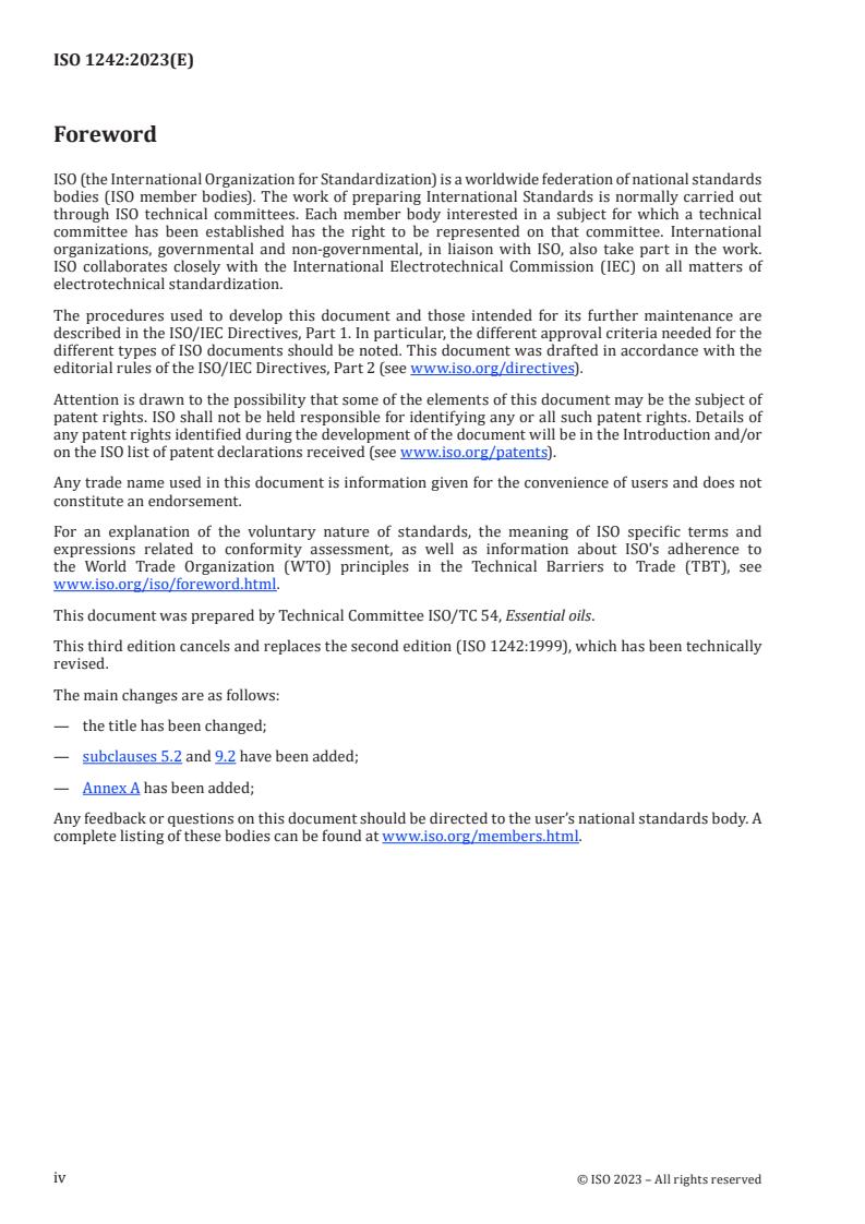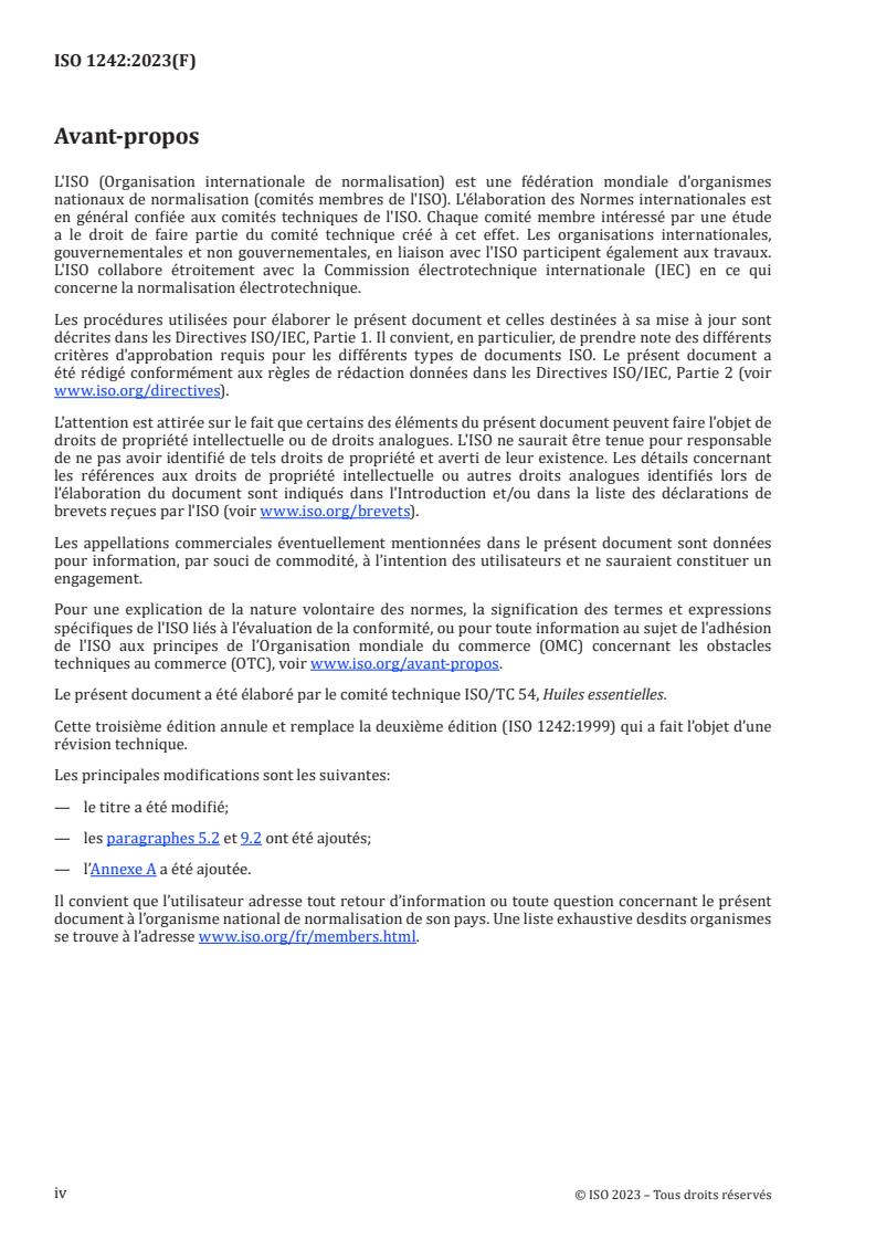 ISO 1242:2023 is a standard published by the International Organization for Standardization (ISO). Its full title is "Essential oils - Determination of acid value by two titration methods, manual and automatic". This standard covers: This document specifies two titration methods for determining the acid value in essential oils. These two methods are not applicable to essential oils containing appreciable quantities of lactones (e.g. Massoïa essential oil).