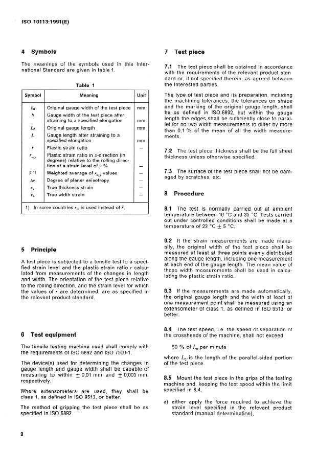 ISO 10113:1991 is a standard published by the International Organization for Standardization (ISO). Its full title is "Metallic materials — Sheet and strip — Determination of plastic strain ratio". This standard covers: Specifies a method for determining the plastic strain ratio of flat metallic products. Describes the principle, the test equipment, the test piece, the test procedure, the expression of results, and the contents of the test report.