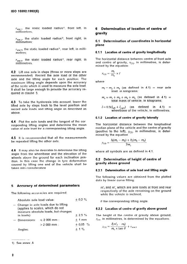 ISO 10392:1992 is a standard published by the International Organization for Standardization (ISO). Its full title is "Road vehicles with two axles — Determination of centre of gravity". This standard covers: Specifies a method to determine the location of the centre of gravity. Other procedures may exist and be used, employing more elaborate and sophisticated methods and equipment, such as tilt-tables and cradles. Annex A gives a method of determining static loaded radius, Annex B includes a standard of test report.