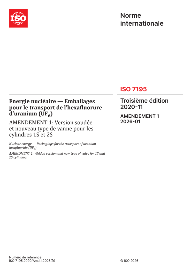 ISO 7195:2020/Amd 1:2026 is a standard published by the International Organization for Standardization (ISO). Its full title is "Nuclear energy — Packagings for the transport of uranium hexafluoride (UF6) — Amendment 1: Welded version and new type of valve for 1S and 2S cylinders". This standard covers: Nuclear energy — Packagings for the transport of uranium hexafluoride (UF6) — Amendment 1: Welded version and new type of valve for 1S and 2S cylinders