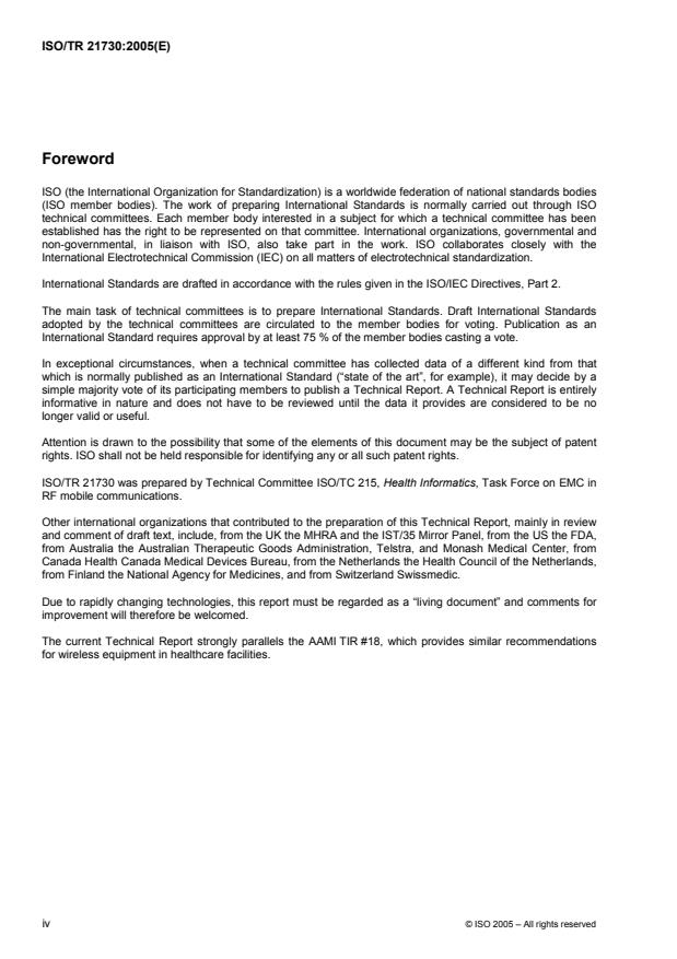 ISO/TR 21730:2005 is a technical report published by the International Organization for Standardization (ISO). Its full title is "Health informatics — Use of mobile wireless communication and computing technology in healthcare facilities — Recommendations for the management of unintentional electromagnetic interference with medical devices". This standard covers: ISO 21730:2005 provides guidance for the deployment, use and management of mobile wireless communication and computing equipment in the healthcare facility in a way that helps mitigate potential hazards due to electromagnetic interference (EMI) with medical devices. The recommendations recognize the different resources, needs, concerns and environments of healthcare organizations around the world and provide detailed management guidelines for healthcare organizations that desire full deployment of mobile wireless communication and computing technology throughout their facility, as well as selective restrictions for healthcare organizations that have decided comprehensive management procedures are not feasible, practical, or desirable at the present time. The recommendations also distinguish between controlled systems used by doctors and staff for healthcare-specific communication and health informatics transport vs. non-controlled (personal) mobile wireless equipment randomly brought into the facility by visitors, patients and the healthcare organization workforce.