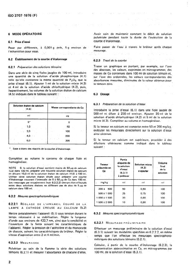 ISO 3707:1976 is a standard published by the International Organization for Standardization (ISO). Its full title is "Phosphoric acid for industrial use (including foodstuffs) — Determination of calcium content — Flame atomic absorption method". This standard covers: Applicable to products having a Ca content of more than 50 mg/kg. Soluble SiO2 present in the solution at levels lower than 5 g/ml does not interfere. The principle consists in addition, to a hydrochloric acid solution of the test portion, of sodium ions to promote and stabilize the emission of calcium and of lanthanum ions to suppress the interference of aluminium. Specifies the aspiration of the solution into an acetylene-dinitrogen monoxide flame. Photometric measurement of the absorption of the 422.7-nm line emitted by a hollow- cathode calcium lamp. Has also been approved by the IUPAC.
