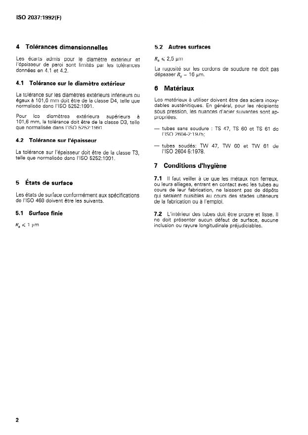 ISO 2037:1992 - Tubes en acier inoxydable pour l'industrie alimentaire