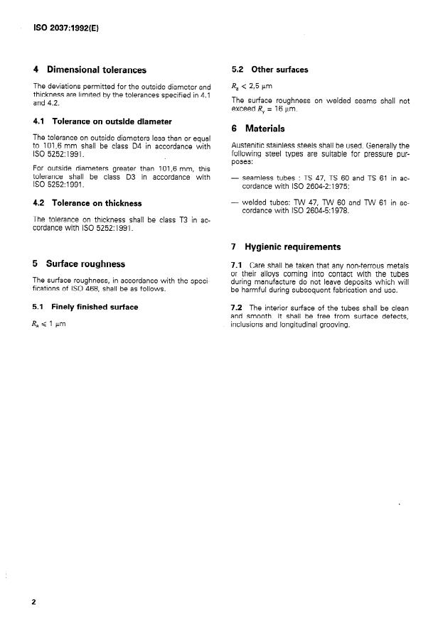 ISO 2037:1992 is a standard published by the International Organization for Standardization (ISO). Its full title is "Stainless steel tubes for the food industry". This standard covers: Specifies the dimensions, tolerances, surface roughness, materials and hygienic requirements for seamless or welded tubes in straight length for the food industry.