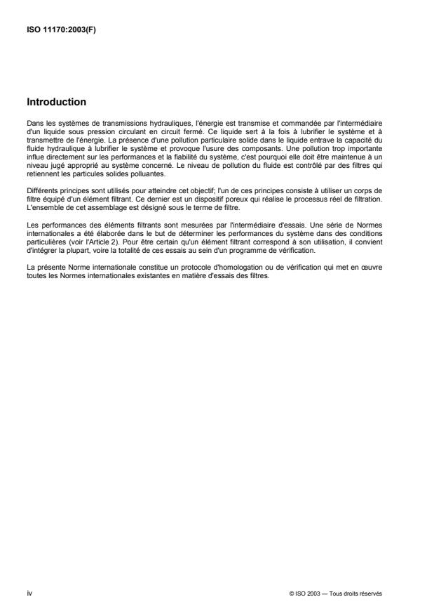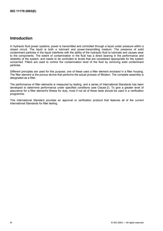 ISO 11170:2003 defines a sequence of tests for verifying filter elements. It can be used to check their hydraulic, mechanical and separation characteristics. ISO 11170:2003 is not intended to qualify a filter for a particular duty or replicate conditions of service. This can only be done by a specific test protocol developed for the purpose, including actual conditions of use (for example the operating fluid). The procedure in ISO 11170:2003 is applicable to individual fluids, or types of fluids having similar chemistry.