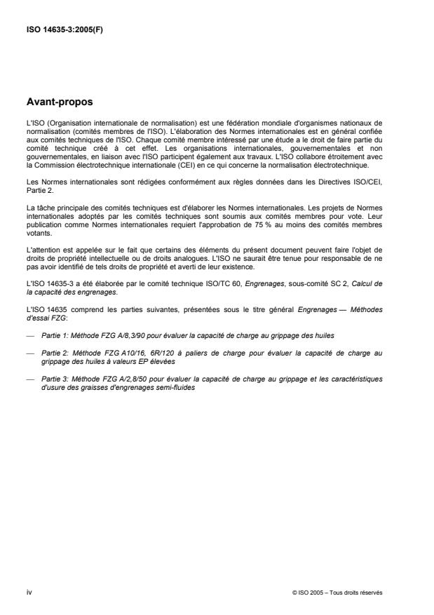 L'ISO 14635-3:2005 spécifie une méthode d'essai fondée sur une machine d'essai FZG à configuration quadrilatère ayant pour but de déterminer la capacité de charge relative de graisses d'engrenages semi-fluides, définie par une détérioration superficielle de l'engrenage appelée grippage. La présente méthode d'essai est utile pour évaluer la capacité de charge potentielle au grippage des graisses d'engrenages semi-fluides 0 à 000 de classes NLGI généralement utilisées pour des boîtes d'entraînement par engrenages soumis à de fortes contraintes.