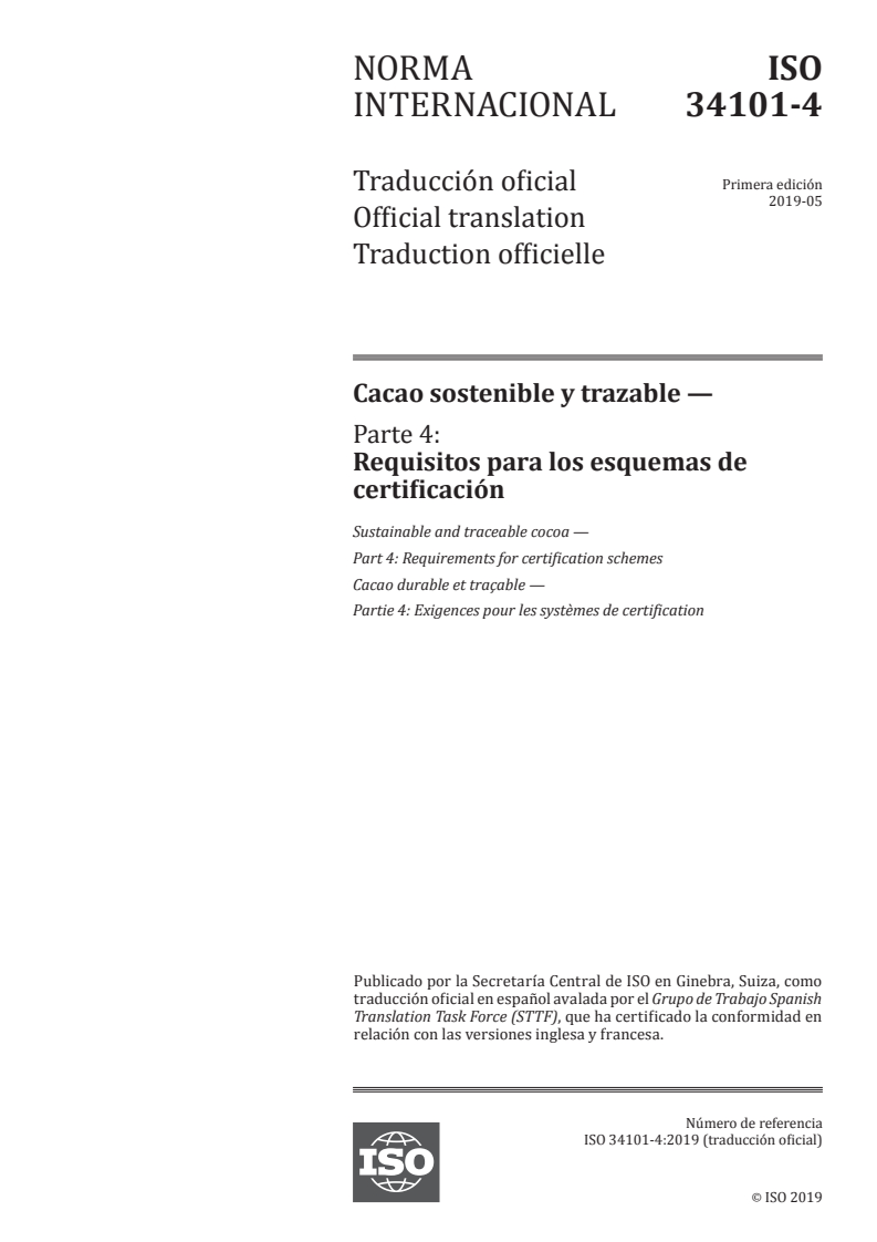 ISO 34101-4:2019 - Sustainable and traceable cocoa — Part 4: Requirements for certification schemes Released:5/6/2019