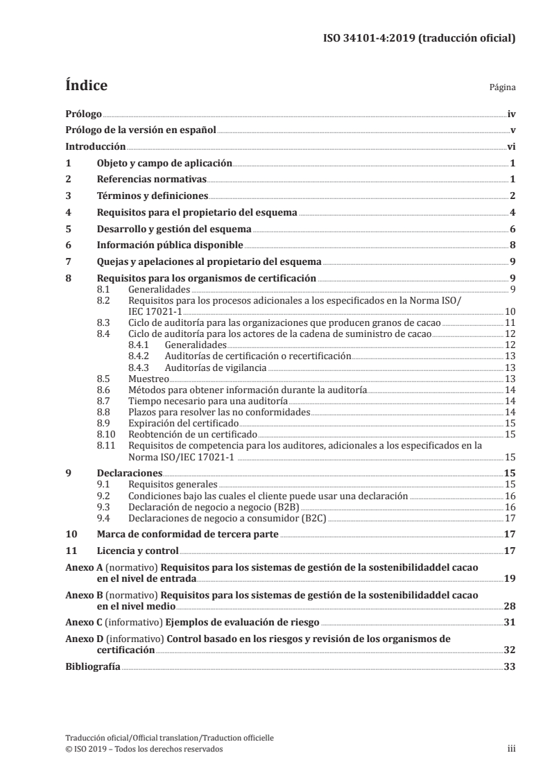 ISO 34101-4:2019 - "Sustainable and traceable cocoa - Part 4: Requirements for certification schemes" defines requirements for certification schemes that verify sustainable and traceable cocoa. It is intended to be used together with the ISO 34101 series (ISO 34101-1, -2 and -3). The standard covers certification of cocoa bean producing organizations and cocoa supply chain actors, and it specifies cocoa sustainability management system requirements at entry (Annex A) and medium (Annex B) levels. (High‑level management system requirements are in ISO 34101-1.) Only organizations that meet both the management system requirements and the performance requirements of ISO 34101-2 can claim cocoa beans are sustainably produced.