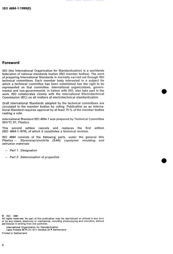 ISO 4894-1:1990 - Plastics -- Styrene/acrylonitrile (SAN) copolymer moulding and extrusion materials