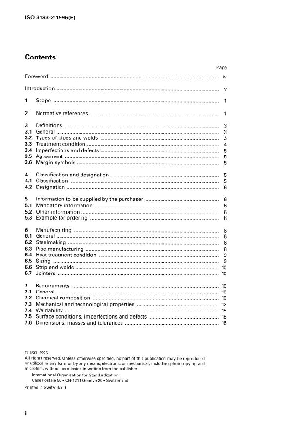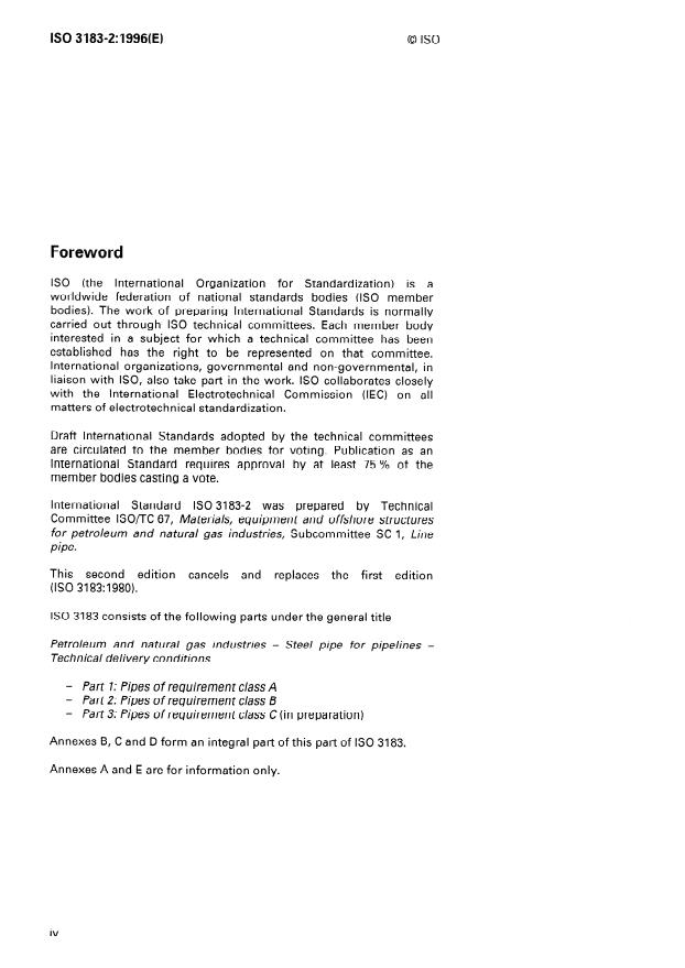 ISO 3183-2:1996 is a standard published by the International Organization for Standardization (ISO). Its full title is "Petroleum and natural gas industries — Steel pipe for pipelines — Technical delivery conditions — Part 2: Pipes of requirements class B". This standard covers: Specifies the technical delivery conditions for unalloyed and alloyed seamless and welded steel pipes. Includes quality and testing requirements. Applies for pipes which are normally used for the transmission of combustible fluids. Does not apply for cast steel pipes. Replaces the first edition.