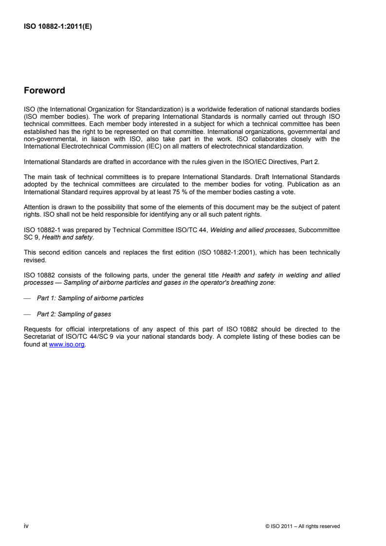 ISO 10882-1:2011 - Health and safety in welding and allied processes — Sampling of airborne particles and gases in the operator's breathing zone — Part 1: Sampling of airborne particles Released:9/26/2011