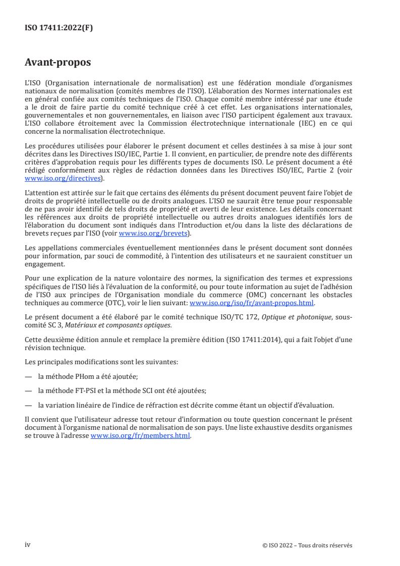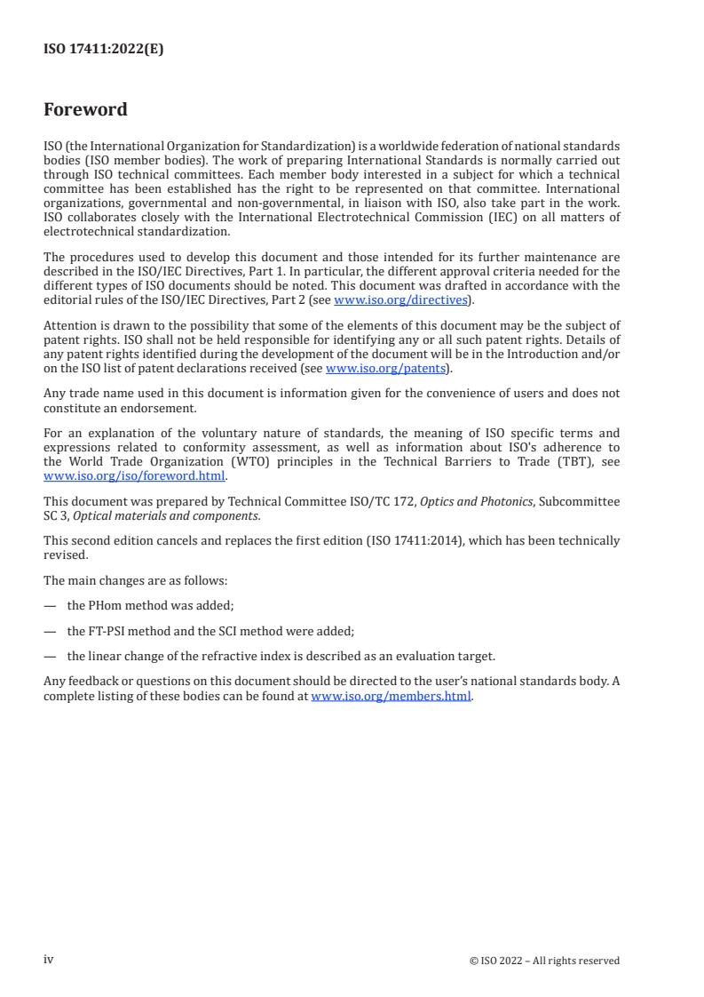 ISO 17411:2022 is a standard published by the International Organization for Standardization (ISO). Its full title is "Optics and photonics - Optical materials and components - Test method for homogeneity of optical glasses by laser interferometry". This standard covers: This document specifies the measuring method for the homogeneity of the refractive index of optical glasses by laser interferometry to cope with the grades from ISO 10110-18 and ISO 12123.