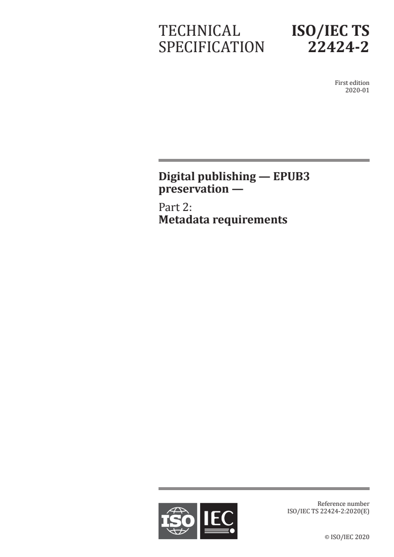 ISO/IEC TS 22424-2:2020 - Digital publishing — EPUB3 preservation — Part 2: Metadata requirements Released:1/29/2020