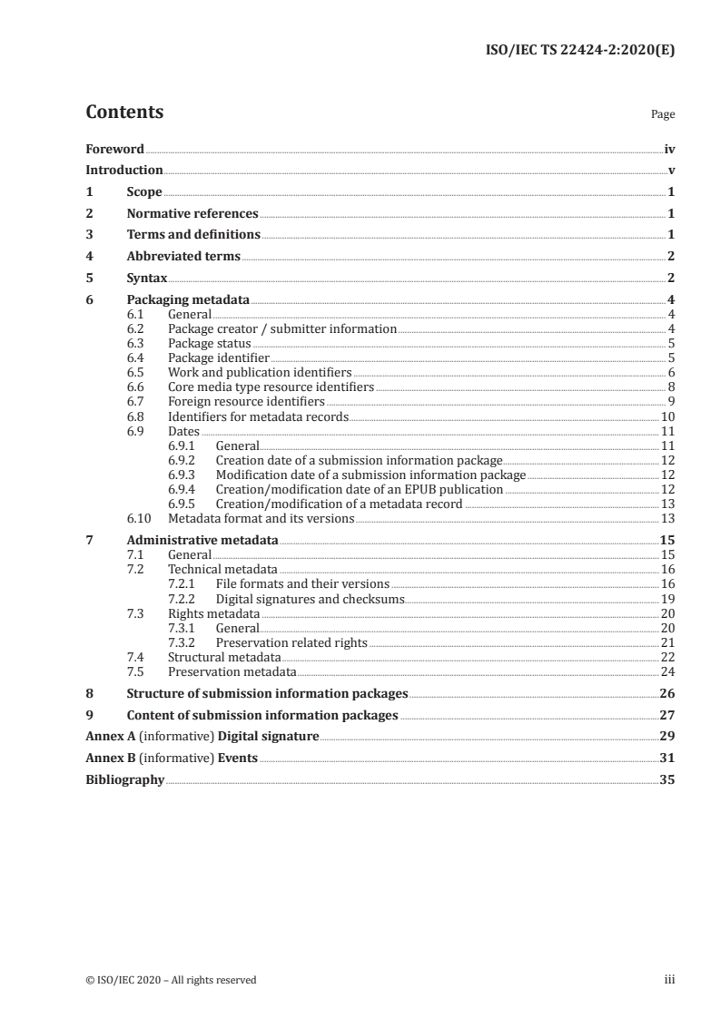ISO/IEC TS 22424-2:2020 - Digital publishing - EPUB3 preservation - Part 2: Metadata requirements specifies the metadata elements and packaging practices needed to support long-term preservation of EPUB publications. Targeting EPUB 3 and 3.0.1, the technical specification helps repositories and OAIS-style archives ingest EPUB publications in a way that supports future access, migration and provenance tracking. The document focuses on mandatory and recommended preservation metadata and their encoding (with emphasis on METS containers) without changing EPUB standards themselves.