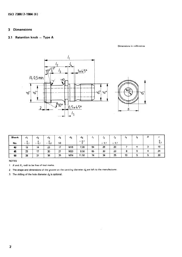 ISO 7388-2:1984 is a standard published by the International Organization for Standardization (ISO). Its full title is "Tool shanks with 7/24 taper for automatic tool changers — Part 2: Retention knobs for shanks Nos. 40, 45 and 50 — Dimensions and mechanical characteristics". This standard covers: Applies for feeding tools from the magazine to the spindle and vice-versa. The retention knobs are intended for the mounting of the tools in the spindles. ISO 7388-2 lays down retention knobs in type A and in type B.