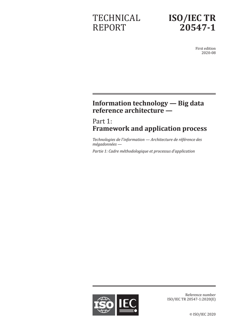 ISO/IEC TR 20547-1:2020 - Information technology — Big data reference architecture — Part 1: Framework and application process Released:8/20/2020