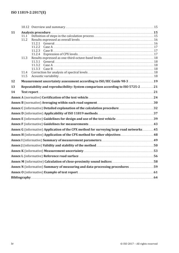 ISO 11819-2:2017 is a standard published by the International Organization for Standardization (ISO). Its full title is "Acoustics - Measurement of the influence of road surfaces on traffic noise - Part 2: The close-proximity method". This standard covers: ISO 11819-2:2017 specifies a method of evaluating different road surfaces with respect to their influence on traffic noise, under conditions when tyre/road noise dominates. The interpretation of the results applies to free-flowing traffic travelling on essentially level roads at constant speeds of 40 km/h and upwards, in which cases tyre/road noise is assumed to dominate (although in some countries it is possible that tyre/road noise does not dominate at 40 km/h when the proportion of heavy vehicles is high). For other driving conditions where traffic is not free-flowing, such as at junctions or under heavy acceleration, and where the traffic is congested, the influence of the road surface on noise emission is more complex. This is also the case for roads with high longitudinal gradients and a high proportion of heavy vehicles. A standard method for comparing noise characteristics of road surfaces gives road and environment authorities a tool for establishing common practices or limits as to the use of surfacings meeting certain noise criteria. However, it is not within the scope of this document to suggest such criteria. ISO 11819-1 defines another method: the statistical pass-by (SPB) method. The close-proximity (CPX) method specified in the present document has the same main objectives as the SPB method, but is intended to be used specifically in applications that are complementary to it, such as: - noise characterization of road surfaces at almost any arbitrary site, with the main purpose of checking compliance with a surface specification (an example for conformity of production is suggested in Reference [1]); - checking the acoustic effect of maintenance and condition, e.g. wear of and damage to surfaces, as well as clogging and the effect of cleaning of porous surfaces; - checking the longitudinal and lateral homogeneity of a road section; - the development of quieter road surfaces and research on tyre/road interaction. NOTE This document does not describe the conditions of application for formal purposes of the measurement with the CPX method. Such conditions may be defined in other standards or legal texts. However, suggestions for the applicability of ISO 11819-1 and this document are provided in Annex D. Measurements with the CPX method are faster and more practical than with the SPB method, but are more limited in the sense that it is relevant only in cases where tyre/road noise dominates and power unit noise can be neglected. Furthermore, it cannot take heavy vehicle tyre/road noise into account as fully as the SPB method can, since it uses a light truck tyre as a proxy for heavy vehicle tyres and does not take power unit noise into account. The CPX method specified in this document is intended to measure the properties of road surfaces, not the properties of tyres. If the method is used for research purposes, to provide an indication of differences between tyres, the loads and inflations would normally be adjusted to other values than specified in this document.