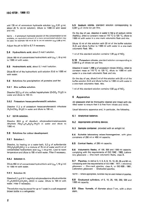 ISO 6739:1988 is a standard published by the International Organization for Standardization (ISO). Its full title is "Whey cheese — Determination of nitrate and nitrite contents — Method by cadmium reduction and spectrometry". This standard covers: Is suitable for all kinds of whey cheese. The principle of determination consists in extracting the whey cheese with warm water, precipitating the fat and proteins, filtering and reducing the nitrate in a portion of the filtrate to nitrite by means of copperized cadmium. The apparatus for nitrate reduction is shown in a figure.