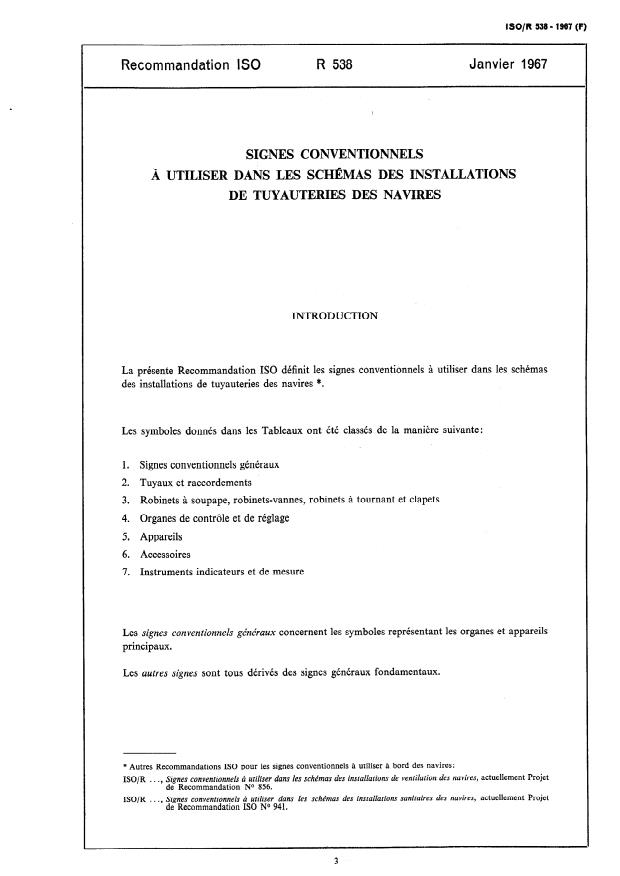 ISO/R 538:1967 - Signes conventionnels a utiliser dans les schémas des installations de tuyauteries des navires